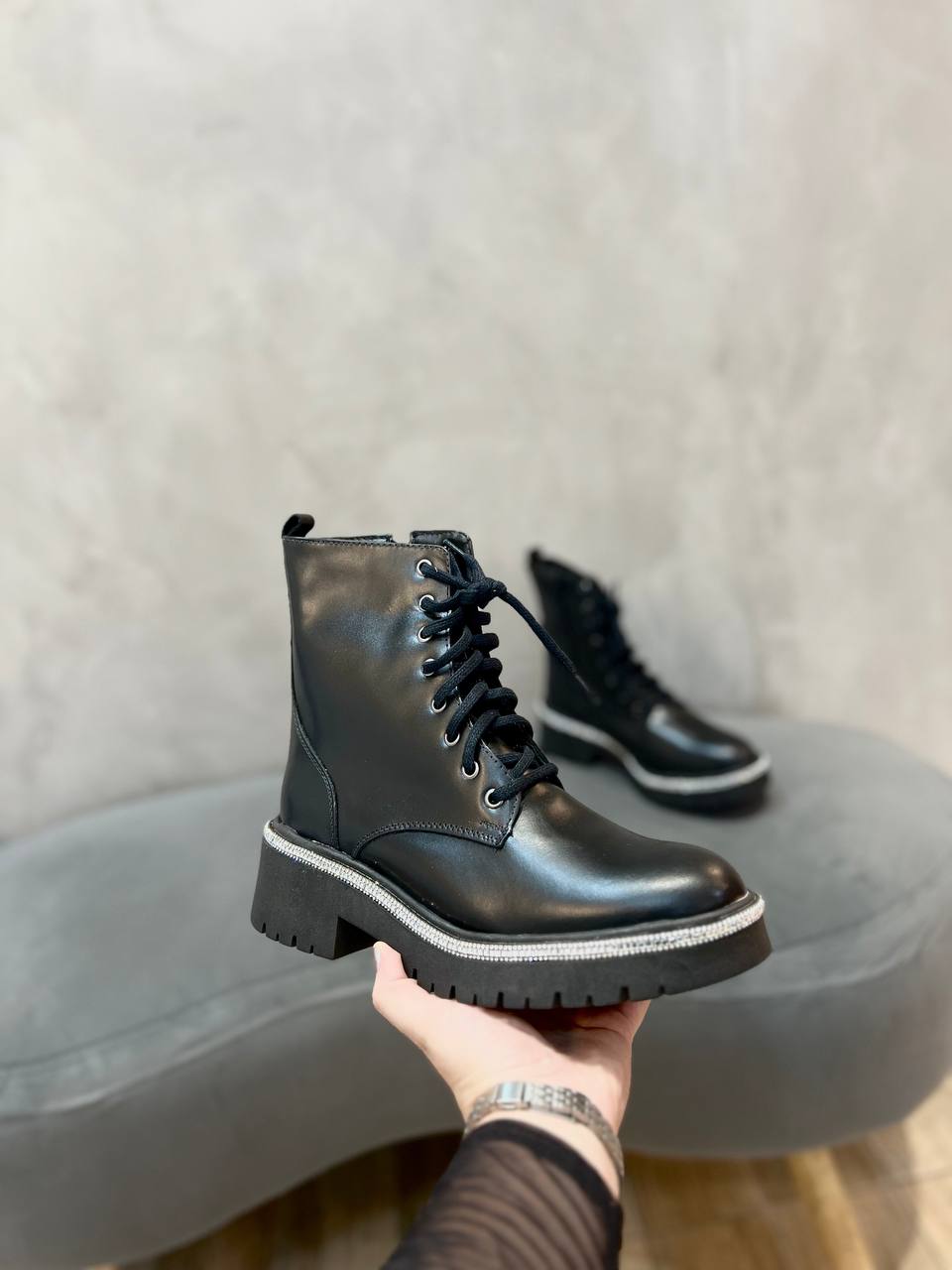 A bota coturno couro preto, conta com detalhe de strass contornando. O modelo é uma versão moderna e ousada. Essencial para compor looks variados.