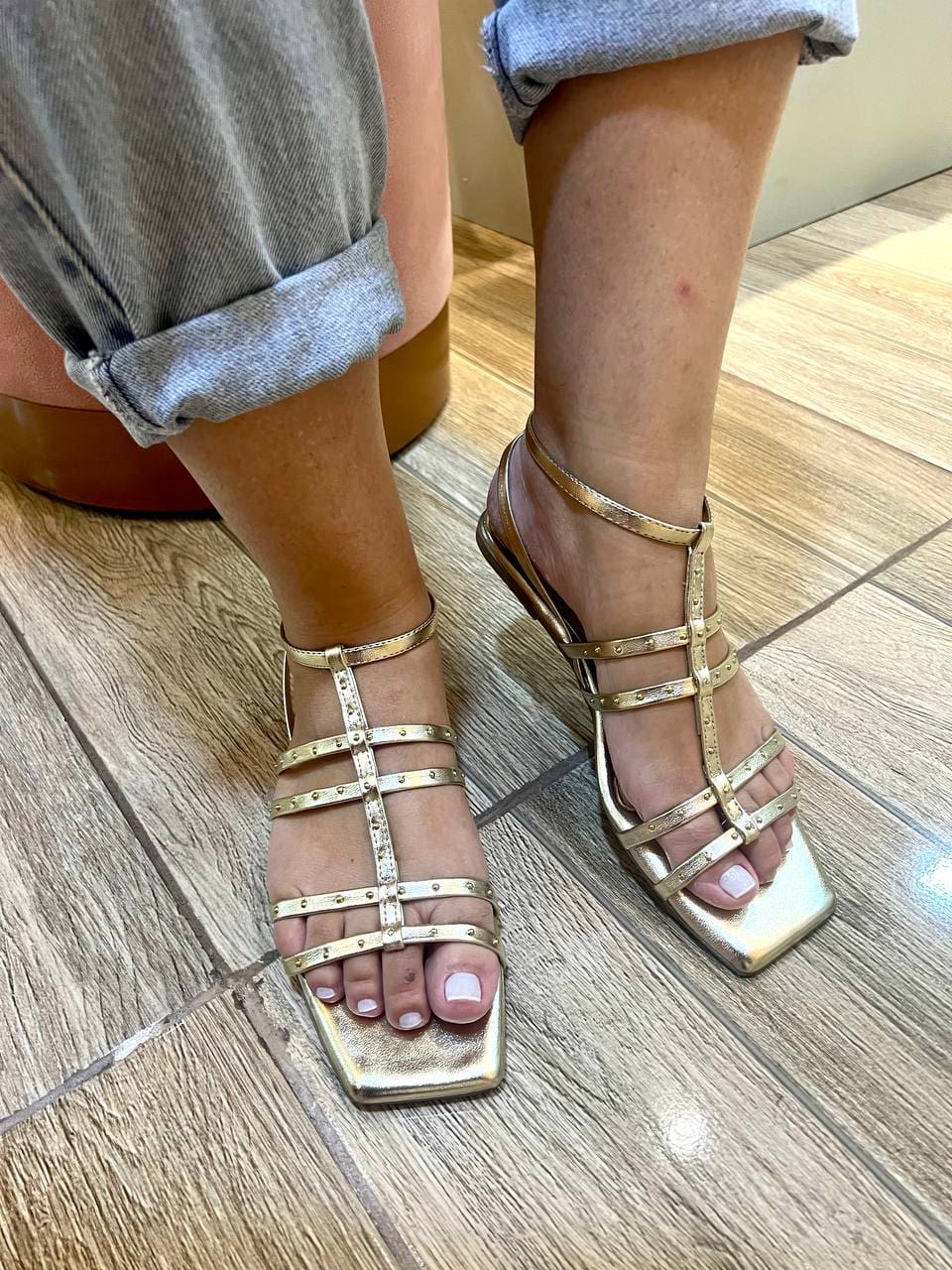 Prática e muito estilo para o seu dia a dia. Esta sandália de tiras é ideal para um passeio com amigos ou uma tarde em um barzinho, este modelo complementa qualquer look com muita atitude. Sua cor metalizada em ouro light, com aplicação em spikes na mesma cor, com tiras transpassadas, trazendo um estilo a mais para qualquer look que você decidir. O fechamento desta rasteira é em fivela trazendo uma delicadeza e charme para harmonizar com seu estilo mais casual.