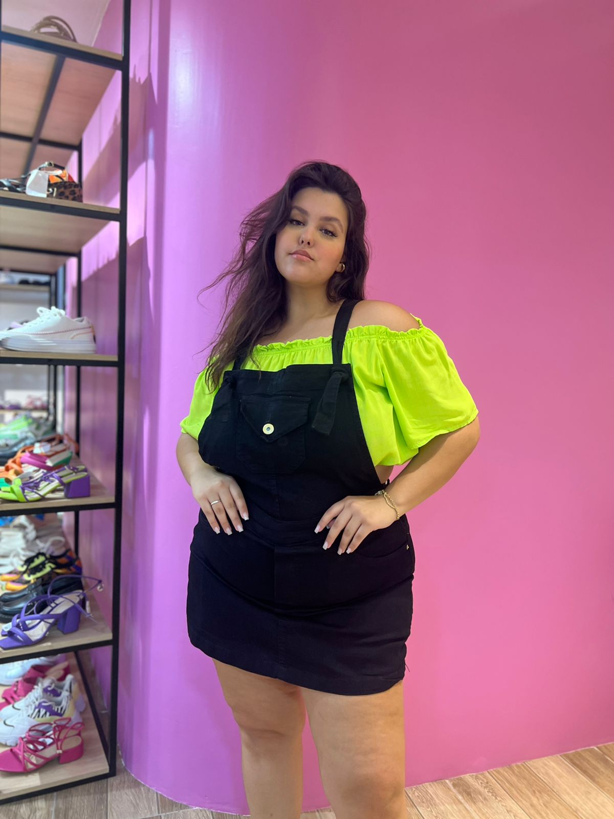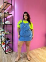 Jardineira short saia com lycra.